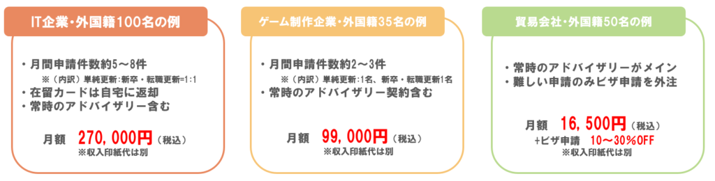 | 在留管理のアウトソーシング | 業種、人数・契約期間に合わせて料金を設定 |