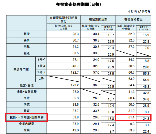 上記だけ見ると、「技術・人文知識・国際業務」への変更申請は概ね2か月のように見えますが、この統計でーたは全国の入管の平均日数であることに注意が必要です。入管によっては比較的すいている入管と、混雑をしている入管があります。例えば、東京入管は比較的混雑している入管になりますが、この表の日数が平均と考えると、2か月以上かかることを想定したほうがよいでしょう。