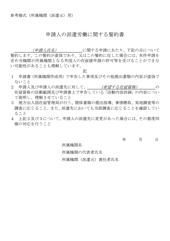 【派遣元(所属機関)用の誓約書】